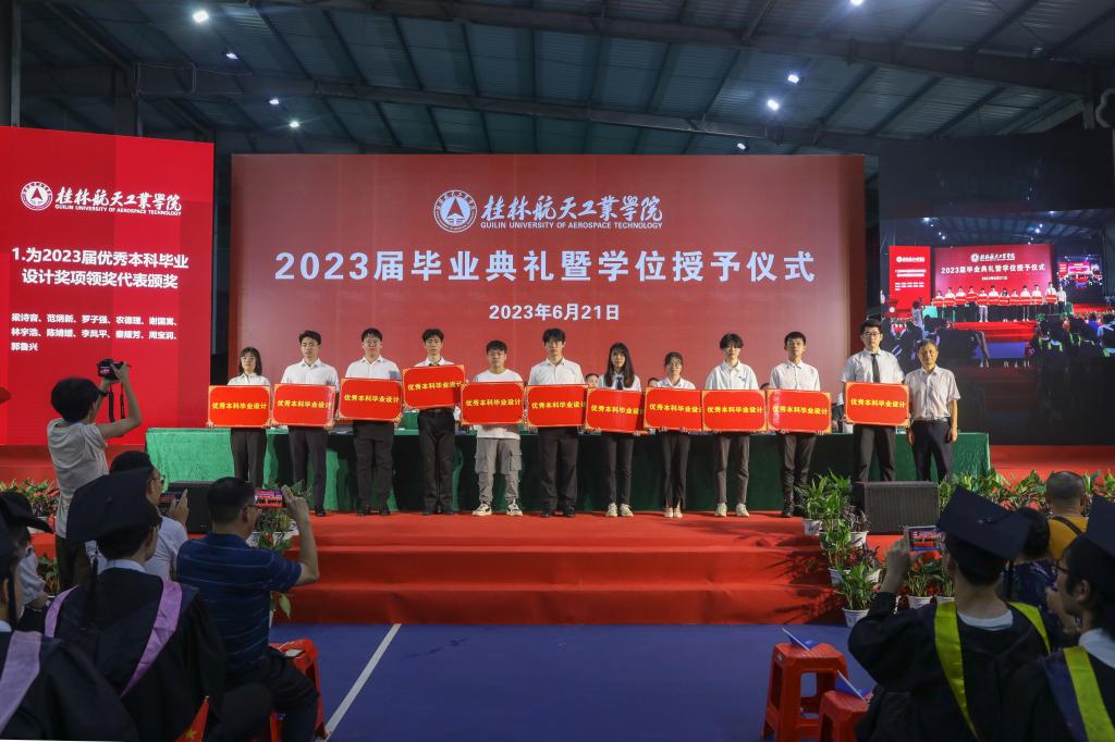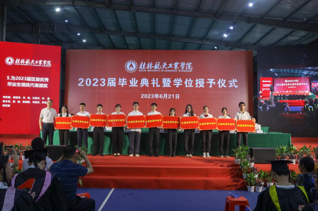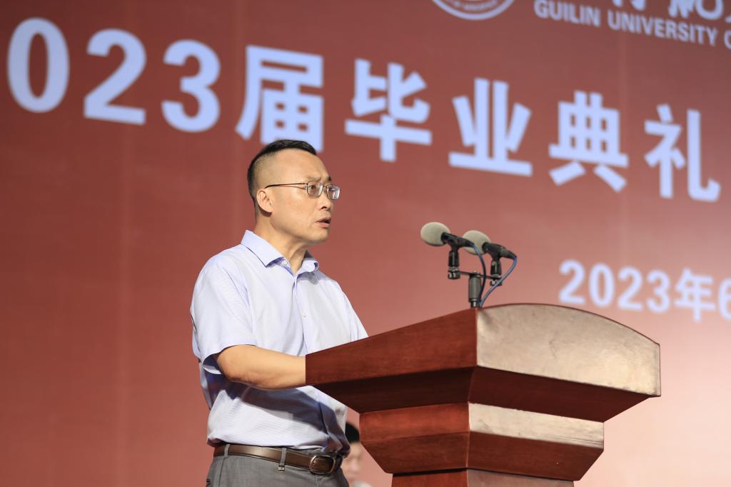 校长吴尽昭在致辞中向4590名求学功成的毕业生表示祝贺。他说,在过去的日子里,各位毕业生与全国人民一起见证了祖国的发展,与学校发展一同成长,一同走过了特殊的时光,创造了不一样的辉煌。即将告别母校,踏上新的征程,桂航学子以不同的方式诠释着桂航人的担当,奔赴祖国最需要的地方,建功立业,绽放青春之花。离别之际,他对毕业生提出四点期许:第一,胸怀理想,在报效祖国中成就小我;第二,勇于创新,在攻坚克难中谋事创业;第三,艰苦奋斗,在仰望星空中行稳致远;第四,心存善良,在世俗喧嚣中保持纯粹。也希望各位毕业生胸怀理想,勇于创新,艰苦奋斗,心存善良。唯有志存高远、笃行不怠,才能不负时代、不负人民,遇见未来更好的自己。