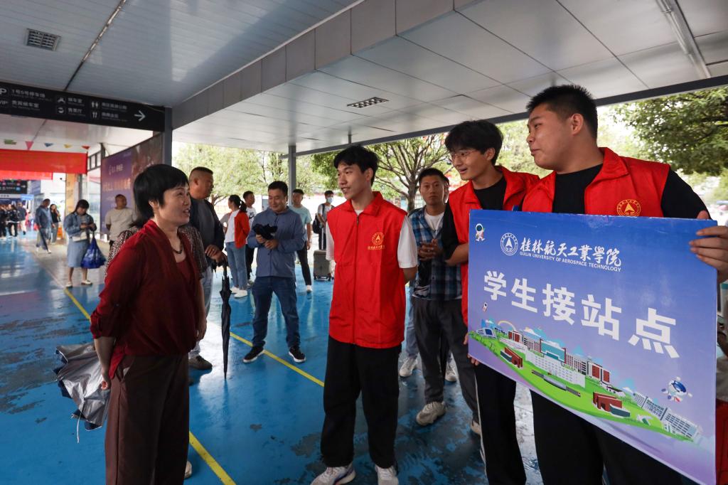 在火车站,吴江萍对坚守岗位的志愿者表示感谢,肯定了他们在风雨中坚守岗位的奉献精神,关心了他们在工作中的身体状况,勉励他们继续发扬桂航精神,以饱满的精神为远道而来的新生留下良好的桂航“第一印象”。