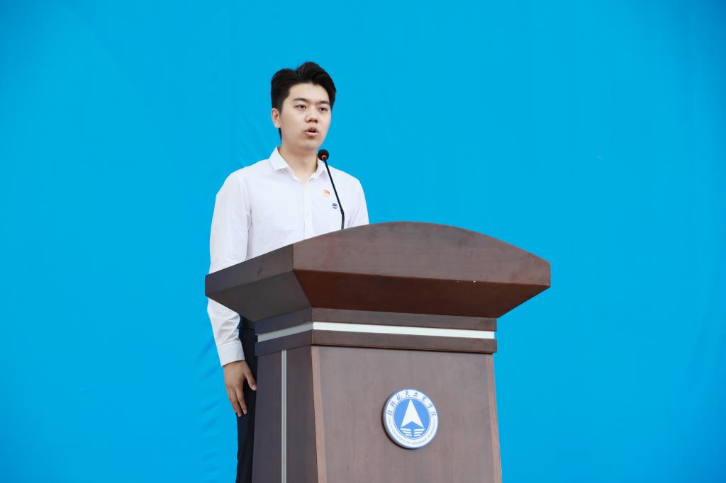 在校生代表——航空服务与旅游管理学院播音与主持艺术专业的李铮同学在发言中说到大学是一个全新的开始,是人生中的一个重要阶段。他希望学弟学妹们要学会适应,要勇于尝试,要保持热爱,在今后的学习生活中不断努力,在青春的赛道上奋力奔跑,不断前进。