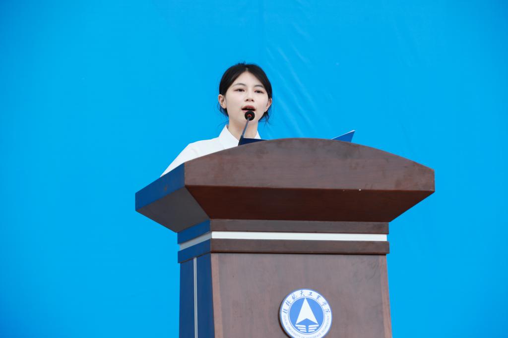 新生代表——航空宇航学院飞行器质量与可靠性专业的叶冬菊同学满怀热情,她表示将沿着桂航人的足迹,踏踏实实求学;养成航天品质,投身报国伟业;在桂航精神的熏陶下,不断攀登,燃烧桂航人的热血青春。