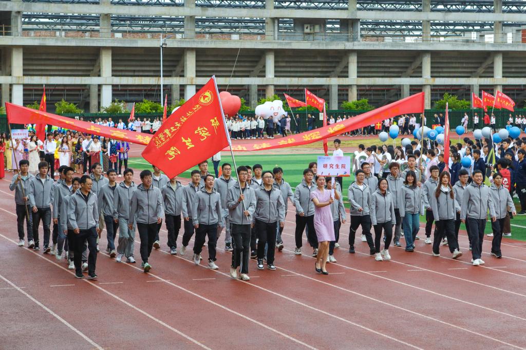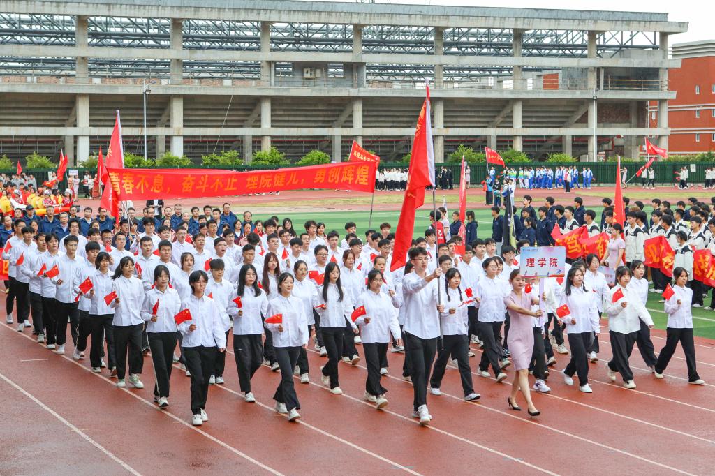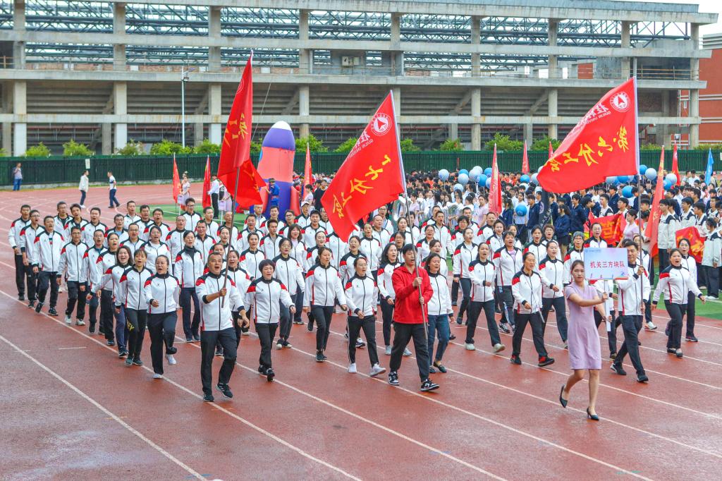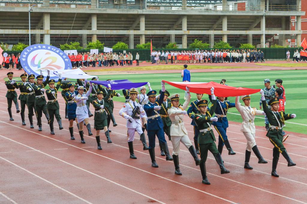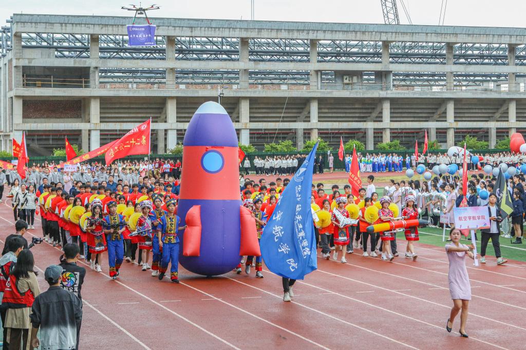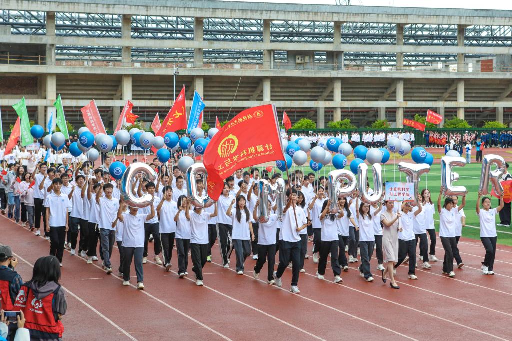 开幕式以精彩的大型团体操表演《青春有你》震撼开场。色彩艳丽的服装,欢快的旋律,同学们以朝气蓬勃的舞姿表达了他们对青春的热爱、对体育事业的热爱、对桂航的热爱,展现了我校的风采。开幕式沿用了与往年一致的入场仪式与院系展演相结合的形式,伴随着响亮的进行曲,来自不同院系和职能部门的方阵身着具有专业特色的队服,用新颖活泼、极具特色的表演和口号诠释着桂航人活力四射的体育精神,赢得全场热烈的喝彩声与掌声。