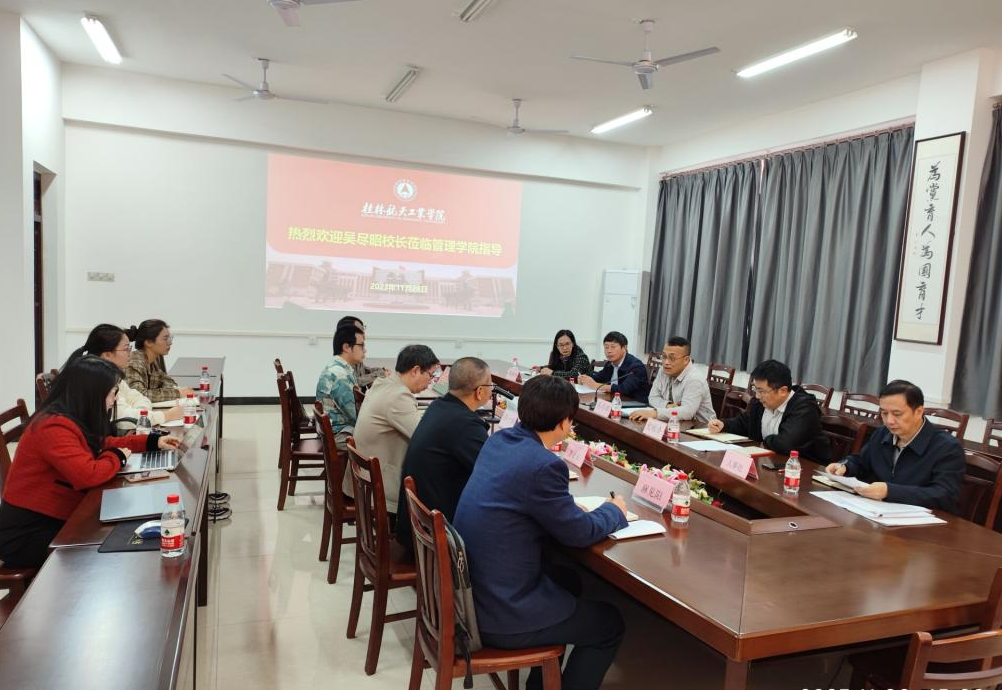 在航空服务与旅游管理学院、传媒与艺术设计学院,吴尽昭就旅游管理学科专业建设开展了专题调研。吴尽昭强调,为深入贯彻落实习近平总书记对广西“五个更大”重要要求、视察广西“4·27”重要讲话和对广西工作系列重要指示精神,贯彻落实习近平总书记关于打造桂林世界级旅游城市的重要指示精神,更好推进我区文化旅游业高质量发展,需进一步梳理和凝练学校旅游管理学科专业建设的定位及特色优势。吴尽昭就“新时代文旅融合背景下如何发挥学科专业优势,助力桂林世界级旅游城市建设、服务地方经济社会”等内容听取与会代表的意见。吴尽昭从人才培养、师资队伍、学科方向、专业特色凝练、服务地方等方面分析了两个学院相关专业学科建设中存在的优势与亮点,同时指出了亟需重点突破的短板与不足。他指出,要继续深入思考相关学科专业发展思路,进一步凝练方向、提炼亮点,不断彰显航天航空特色,鼓励多元创新、打造跨学科交叉融合平台,主动服务地方经济,推进学科建设高质量发展,助力桂林世界级旅游城市建设。
