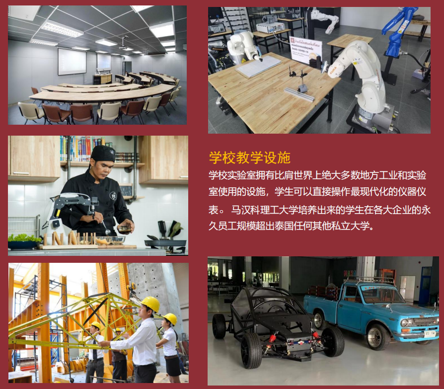 马汉科理工大学(Mahanakorn University of Technology,简称“MUT”),是经泰国教育部批准于1990年成立的一所综合性私立理工类大学。在2021年Scimago排名中,马汉科在学术研究、创新研发、社会实践排名均为全球前500名,在泰国私立学校中排名第一。学校致力于科技研发及以理工科为主的学生培养,在科研和教育领域享誉泰国。尤其是在电子与电气工程领域,其科研成果在泰国具有领先地位。学校设有工程学院、动物医学学院、工商学院以及国际学院。目前,学校开设19个学士学位,9个硕士学位,6个博士学位,有8000多名在校生,500多名教师,教师队伍中博士学历率高达90%以上,均毕业于世界名校,如:英国帝国理工、谢菲尔德大学、泰国朱拉隆功大学及中国科学院等。学校与中国西北工业大学、澳大利亚新南威尔士大学、悉尼大学,英国帝国理工大学、萨里大学,德国汉诺威兽医大学等知名院校建立长期合作关系。