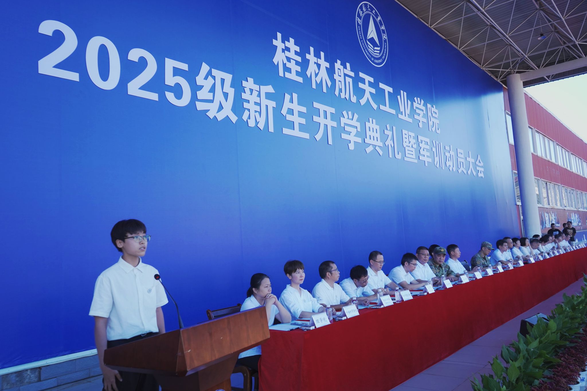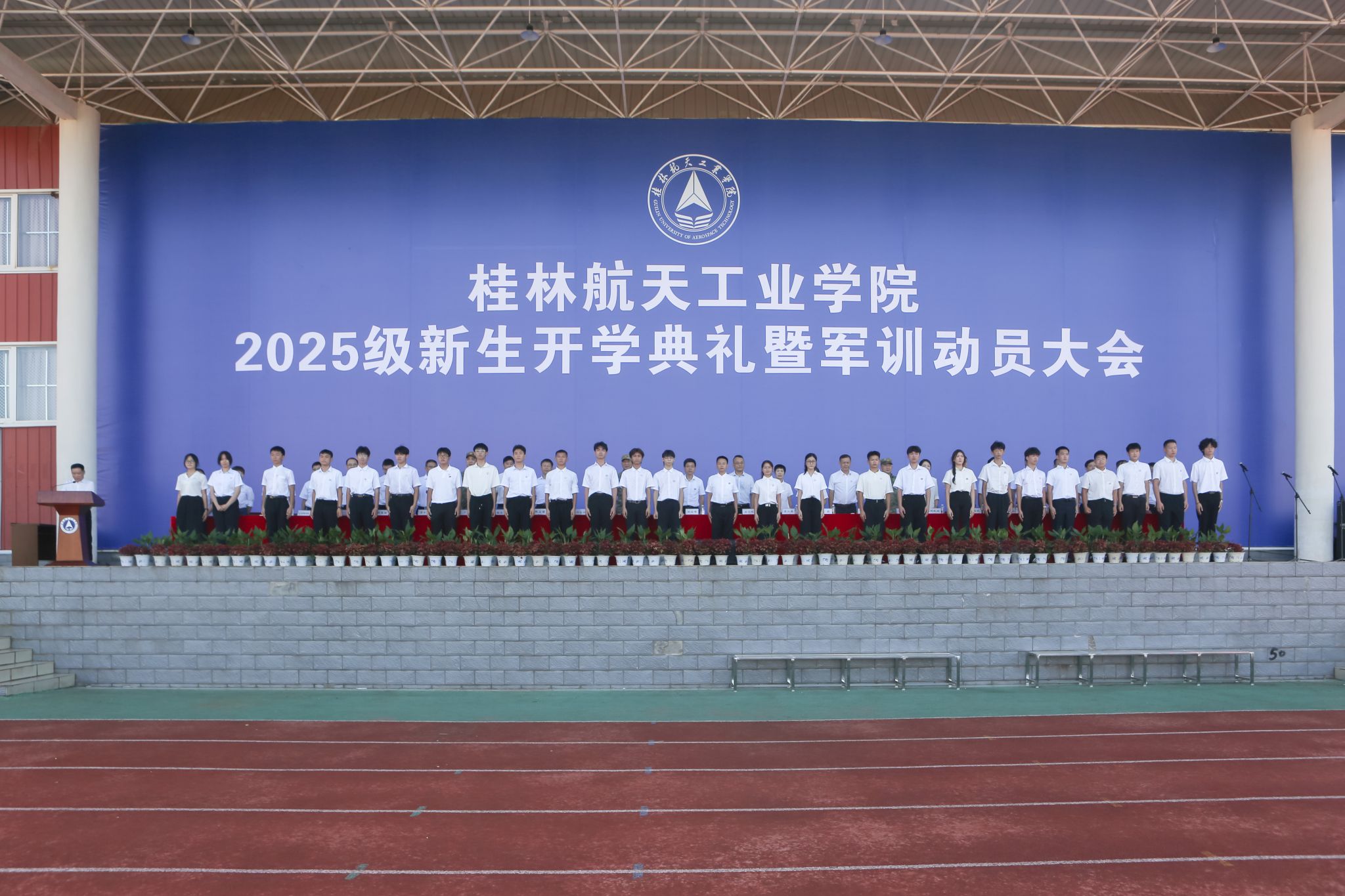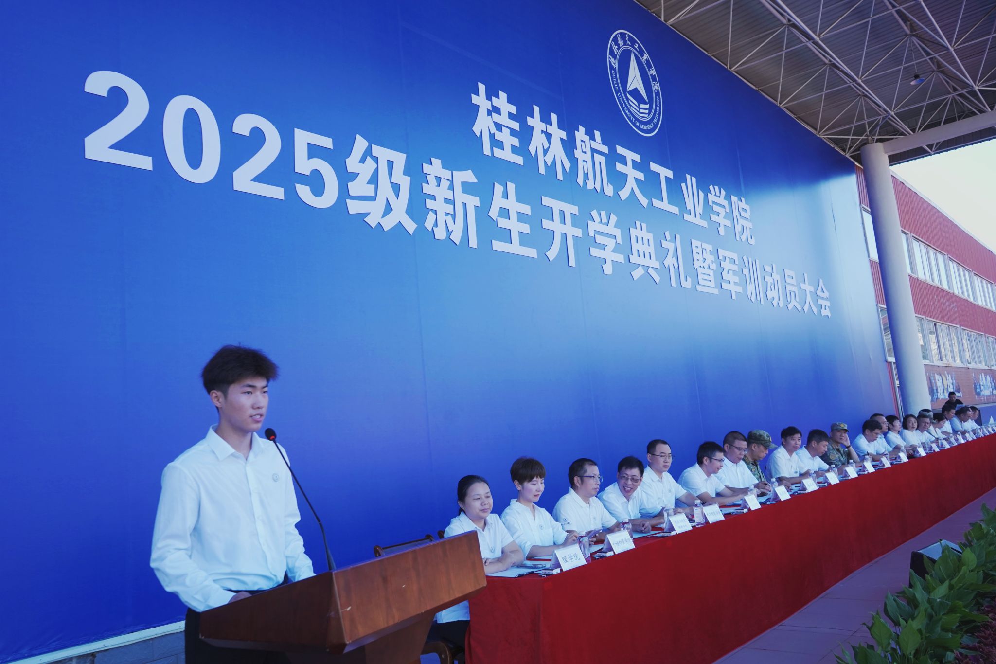 2025级新生代表苏天乐、杨雨翰、龙秋月、陈秀琳四位同学带领新生宣誓,全体新生庄严承诺,发扬桂航精神,秉承桂航校训,传承航天基因,做新时代的“新青年”! 铮铮誓言回荡在尧山之麓,“强国有我”的信念在青年的心中扎根成长。