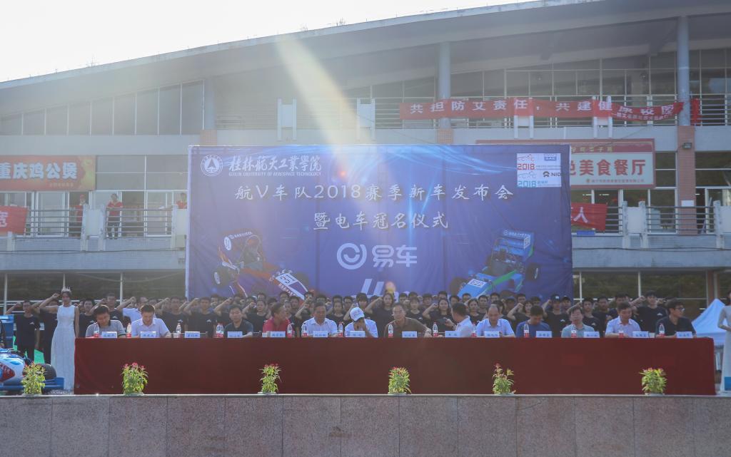 9月21日下午,由我校师生2018赛季自主创新制造的大学生方程式赛车航V-4燃油赛车和航V-E2电动赛车正式对外发布,同时航V-E2电动赛车正式冠名。我校党委副书记刘迎春,易车公司代表陈刚、桂林龙星行汽车销售服务有限公司总经理王俊、桂林新旗亚商贸有限公司董事刘付明、桂林博达汽车科技有限公司董事长、桂林市汽车维修行业协会会长黄景中、广西桂林金伟实业有限公司总经理许炜及我校宣传部、学工部(处)、教务处及相关学院主要负责人出席发布会。