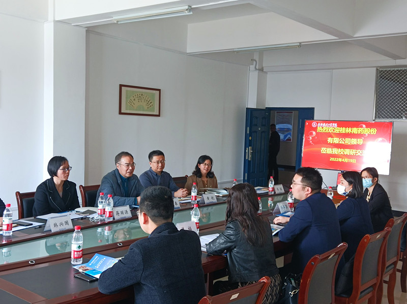 4月19日下午,桂林南药股份有限公司副总裁王建军一行五人到校调研,校党委副书记刘迎春,学工部(处)、教务处、科技处、校团委及二级学院相关负责人参加。
