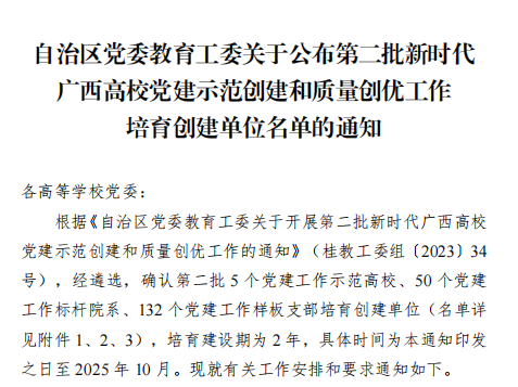 近日,自治区党委教育工委公布第二批新时代广西高校党建示范创建和质量创优工作培育创建单位评选结果。我校机电工程学院党委获评为广西高校党建工作“标杆院系”培育创建单位。汽车工程学院党委教师党支部、能源与建筑环境学院党委学生第一党支部、计算机科学与工程学院党委学生第二党支部、传媒与艺术设计学院党委学生第二党支部获评广西高校党建工作“样板支部”培育创建单位。