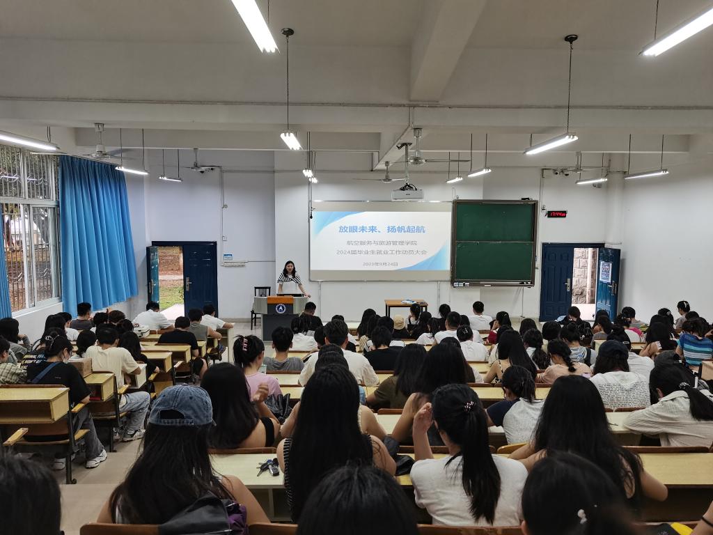 为贯彻落实党中央、国务院关于高校毕业生就业工作的决策部署,进一步推进2024届毕业生实现高质量就业,9月25日下午,航空服务与旅游管理学院在明志楼124教室召开2024届毕业生就业动员大会。学院党委书记张海涛、副书记唐珉、毕业班辅导员和2024届全体毕业生参加本次会议。