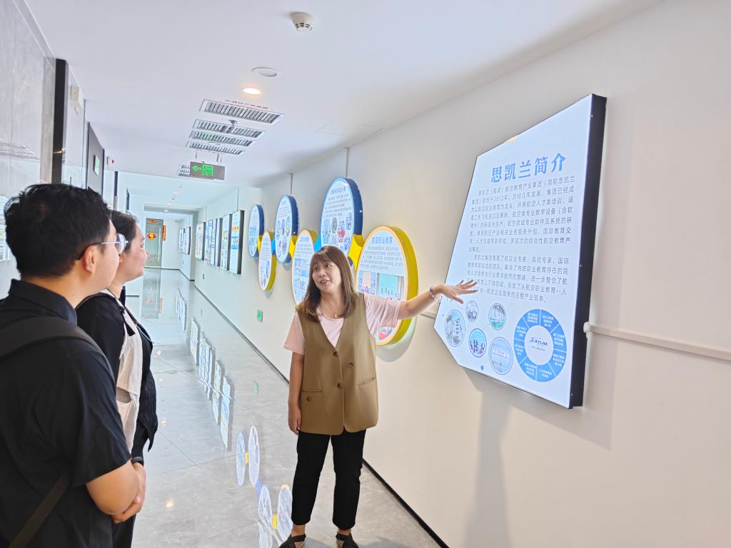 在思凯兰(福建)航空教育产业集团有限公司,就实习就业、专业共建等方面同思凯兰集团及厦门的对口企业深入开展合作。集团董事长季革胜对陈欢副书记一行表示热烈欢迎,并重点介绍了思凯兰发展历程、主营业务以及能力优势。他表示希望以本次调研座谈为契机,充分利用厦门的区位优势及对青年人才的吸引力,在校企之间建立合作桥梁,在产学研落地转化、开展青少年航空研学、学生实习就业等领域达成深入合作。