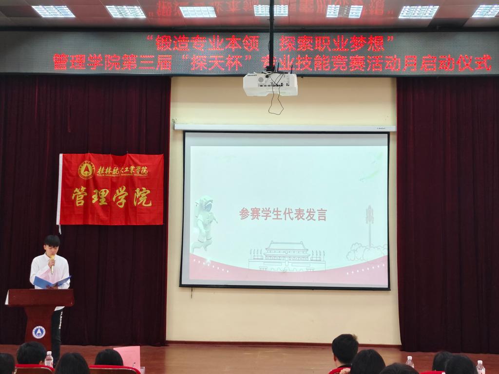 为落实立德树人根本任务,提升学风建设成效,4月1日,管理学院在北校区电教馆举行以“锻造专业本领,探索职业梦想”为主题的第三届“探天杯”专业技能竞赛活动月启动仪式,该院党委副书记潘小玲,团委书记、赛事指导老师、辅导员及参赛学生代表200余人参加仪式。