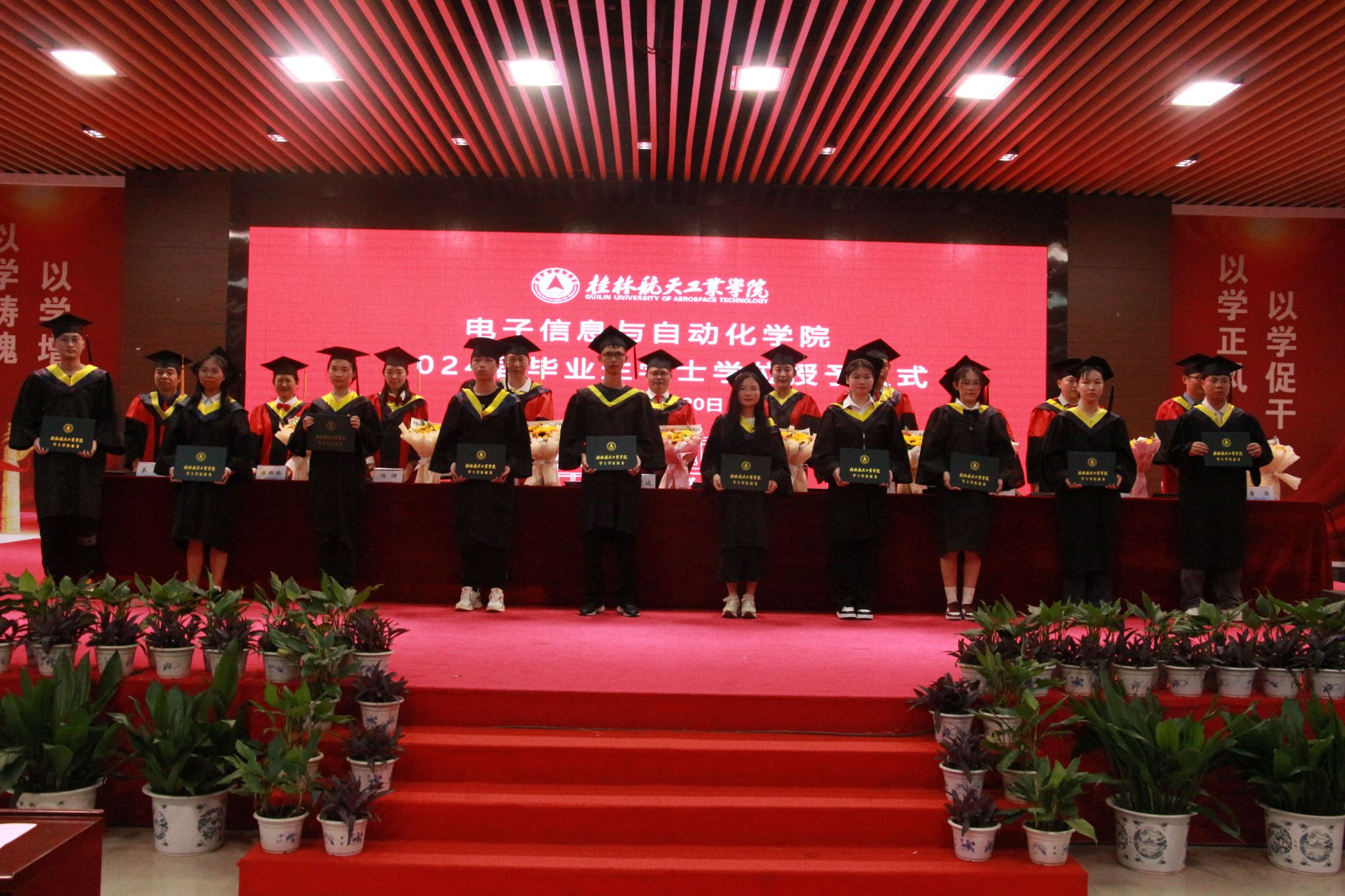院长嵇建波发表《青春为中国式现代化挺膺担当》的致辞。他说,大家在桂航历经四年的奋斗,迎来了收获的季节。聚是一团火,散作满天星,临别之际,希望学子们无论身在何地,都能牢记桂航人的身份,将“尚德、博学、慎思、笃行”的校训精神传播到社会的各个角落,用航天精神服务广大人民群众。一是“愿以寸心寄华夏,且将岁月赠山河”,作为桂航人,当胸怀祖国、信仰坚定,努力成为堪当民族复兴大任的时代新人。二是“立志欲坚不欲锐,成功在久不在速”,作为桂航人,当志存高远、脚踏实地,坚持不懈的努力,让理想照进现实。三是“星光不问赶路人,时光不负实干者”,作为桂航人,当逐光而行、百折不挠。四是“勿以恶小而为之,勿以善小而不为”,作为桂航人,当心有所畏,方能行有所止,以德为先,方能行稳致远。