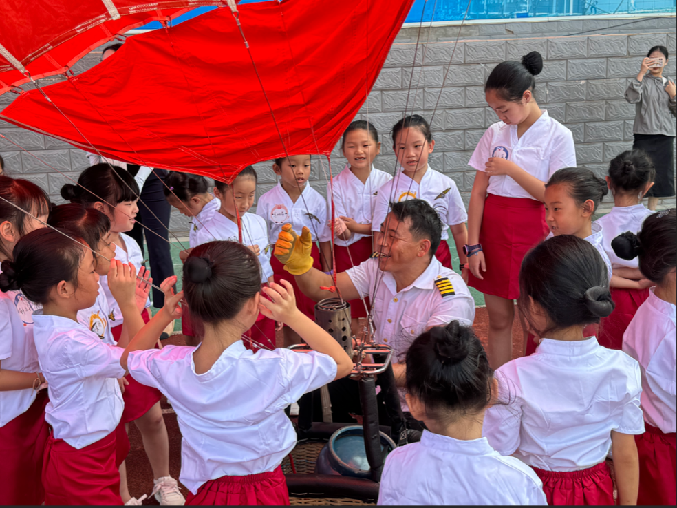 孩子们近距离观察热气球装置,了解飞行原理和航空装备的科技理念