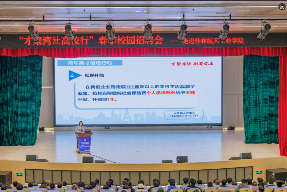 宣讲会上,殷琼书记以“与城市共成长,用青春书写未来”为题,向近1000名师生生动描绘了湾沚的发展蓝图。她从“底蕴深厚的历史之城”“活力迸发的产业之城”“宜居宜业的青年之城”三个维度展开,结合湾沚区在通航产业、低空经济、乡村振兴等领域的战略布局,阐释了青年人才在城市发展中的重要作用。“湾沚正以最大诚意、最优政策、最好环境,为青年搭建逐梦舞台。”湾沚区人社局张英局长重点就“津梧桐”人才计划为高校毕业生提供涵盖创业扶持、住房补贴、职业发展的全链条支持进行介绍,鼓励桂航学子将个人理想融入地方发展。芜湖联合飞机有限公司副经理彭海荣、德力西电气(芜湖)有限公司人事经理周媚丽分别代表参会企业发言,分享了企业在低空经济装备研发、智能电气系统创新等领域的技术突破,并现场发布飞行器设计工程师、智能控制算法工程师等30余个岗位需求。