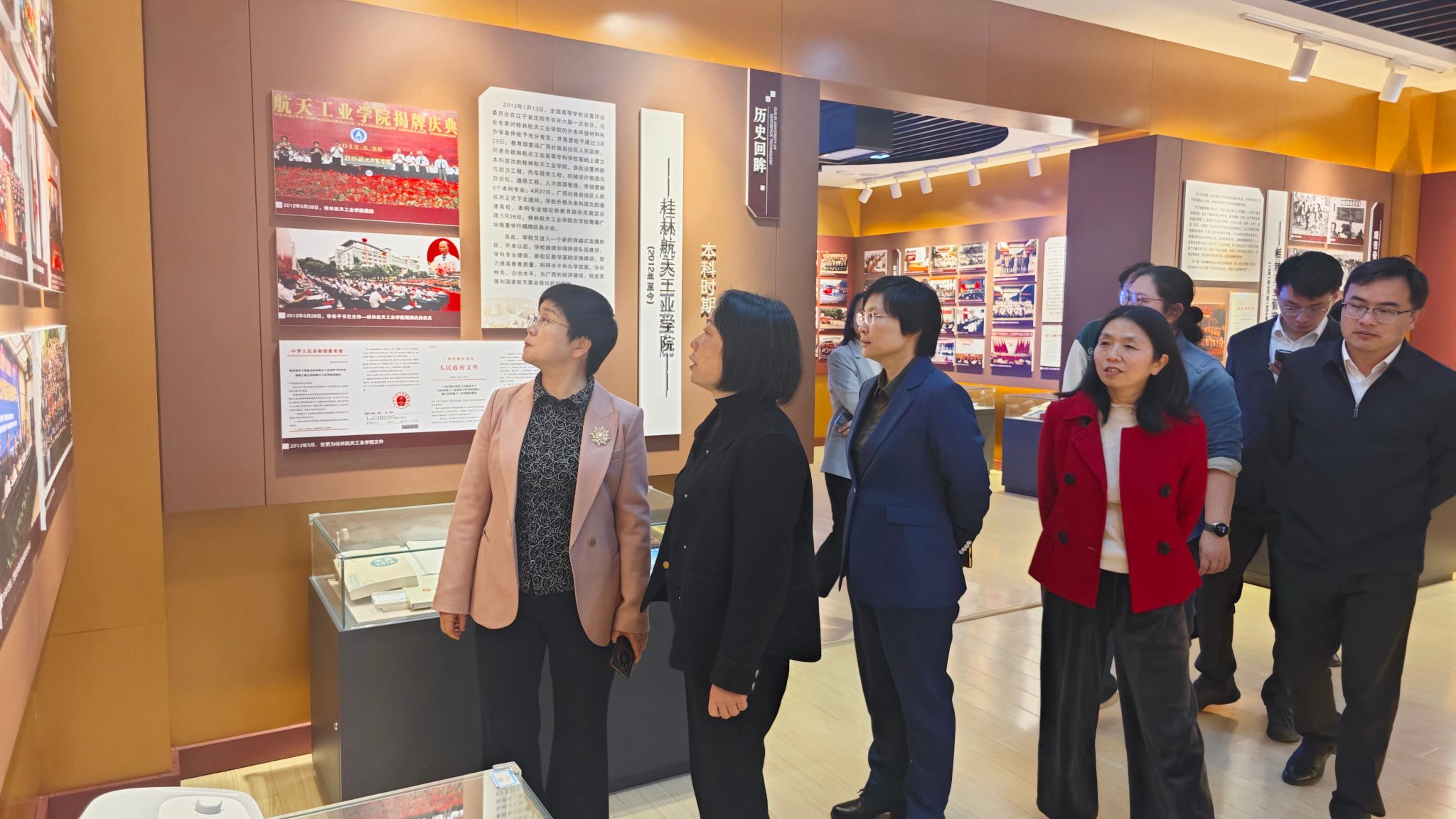 在葛莉副校长的陪同下,殷琼书记一行先后参观了校史馆、航天博物馆、航天品质中心、航空航天工程实验教学中心、广西小型无人机系统及应用工程研究中心、广西无人机技术应用院士工作站等特色平台。每到一处,到访成员都认真听取讲解,深入了解学校在航天特色学科建设、科研创新及人才培养方面的成果。殷琼书记对学校“航天+”特色发展模式给予高度评价,认为学校与湾沚区航空产业布局高度契合,为双方深化合作奠定了坚实基础。