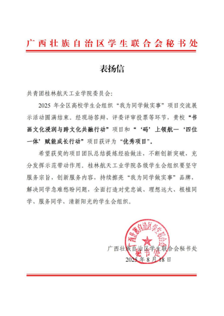 近日,由共青团广西区委指导、广西学联主办的2025年全区高校学生会组织“我为同学做实事”项目交流展示活动获奖名单正式公布。经学校推荐、现场答辩、评委评审投票等环节的激烈角逐,我校“‘码’上领航——‘四位一体’赋能成长行动”与“书画文化浸润与跨文化共融行动”两个项目脱颖而出,成功入选全区优秀项目,学校团委获主办方书面表扬。