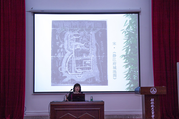桂林山水是何时开始开发的?曾馆长通过一幅《静江府城图》为我们娓娓道来,鹦鹉山上刻的南宋《静江府城图》,民用建筑一概从略,标出的多是军事设施,却看得到漓江沿岸上有许多的游观楼阁,可见,到了唐宋年间,游玩之风盛行可见一斑。
