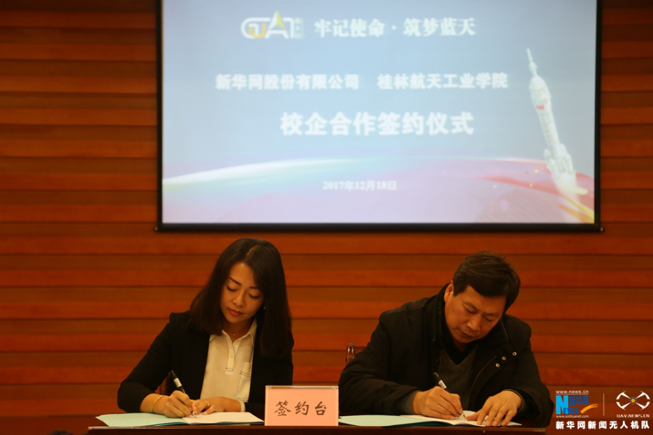 新华网股份有限公司无人机事业部负责人(左)与华体会平台副书记罗延忠签订合作协议。新华网发 杨永昌摄