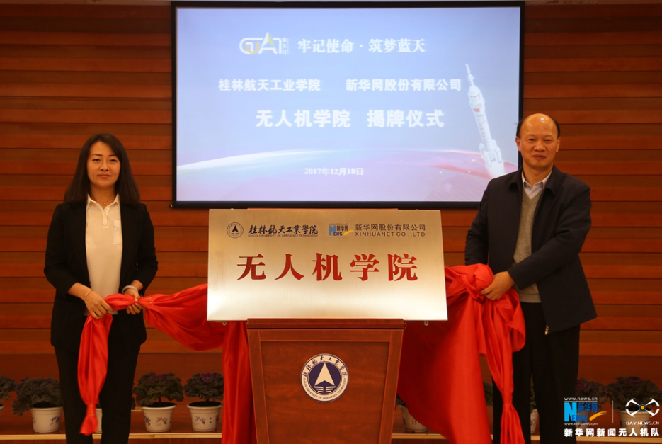 新华网股份有限公司无人机事业部负责人(左)与华体会平台党委书记李幼平为无人机学院揭牌。新华网发 杨永昌摄
