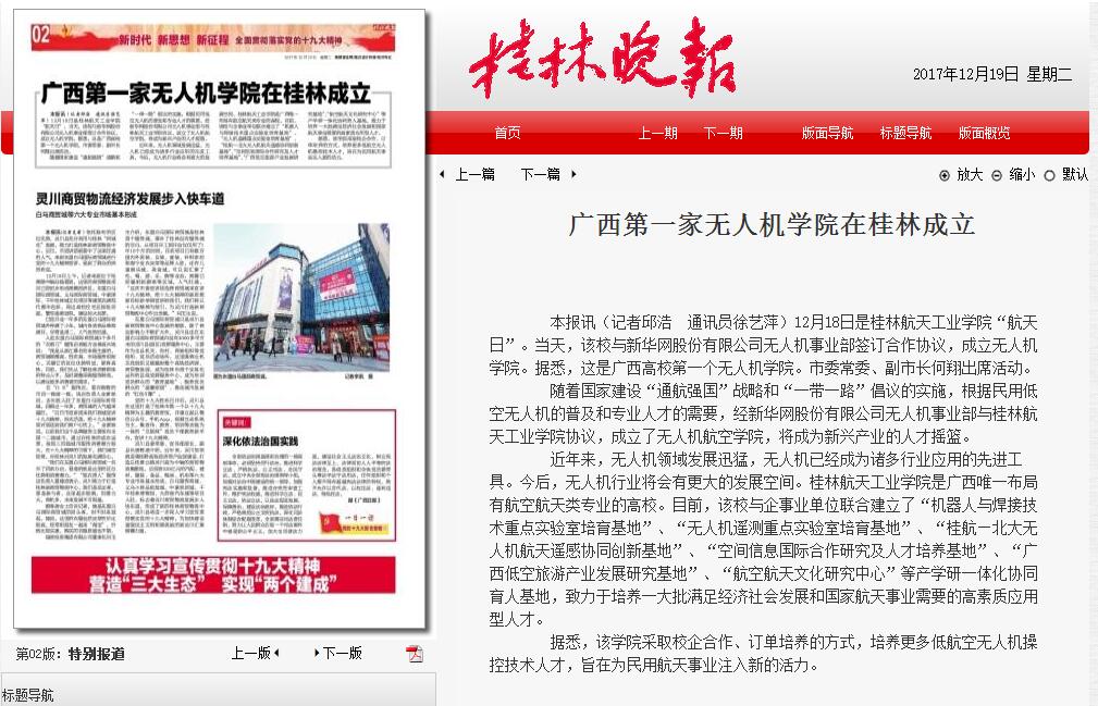 本报讯(记者邱浩 通讯员徐艺萍)12月18日是华体会平台“航天日”。当天,该校与新华网股份有限公司无人机事业部签订合作协议,成立无人机学院。据悉,这是广西高校第一个无人机学院。市委常委、副市长何翔出席活动。