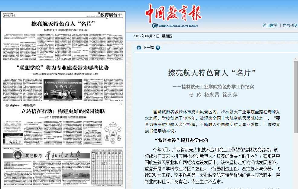 【编者按】近年来,我校紧紧围绕“二次创业”各项工作,以立德树人为根本,优化学科结构,凝练学科发展方向,突出学科建设重点,创新学科组织模式,充分激发我校校内生动力和发展活力,培养具备航天品质的高水平应用型人才,办学特色和水平不断提升,得到行业和社会广泛认可,在建设区域有鲜明特色、行业有重要影响的高水平应用型大学道路上实现了新发展。今天出版的《中国教育报》对此进行了报到,现全文转载。