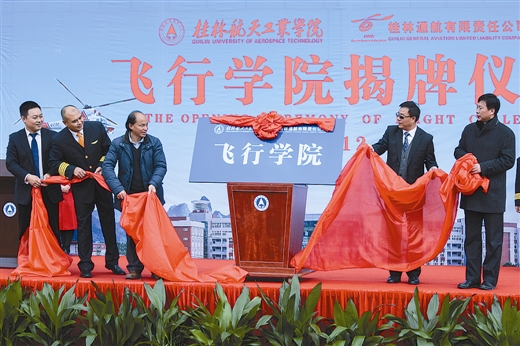 校长易忠与桂林通航有限责任公司负责人共同为飞行学院揭牌。