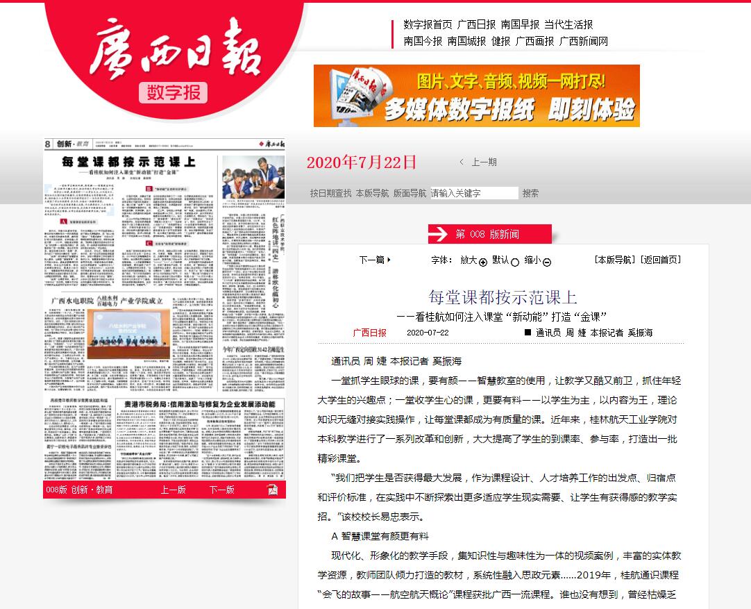 现代化、形象化的教学手段,集知识性与趣味性为一体的视频案例,丰富的实体教学资源,教师团队倾力打造的教材,系统性融入思政元素……2019年,桂航通识课程“会飞的故事——航空航天概论”课程获批广西一流课程。谁也没有想到,曾经枯燥乏味的“航概”课,如今成了广受学生们喜欢的“金课”。
