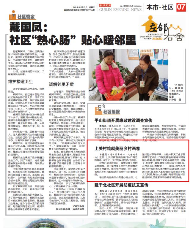 11月25日,桂林晚报刊登题为《上关村绘就美丽乡村画卷》文章,报道了我校传媒与艺术设计学院党员教师曹佳欣带领“艺航”墙绘工作室同学们利用周末时间义务为七星村委上关村绘制壁画的志愿活动。