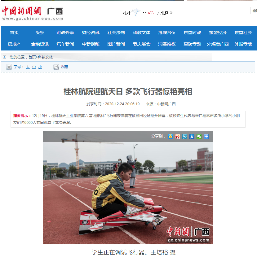 据悉,本次飞行器表演赛是该校第六届“航天日”系列活动之一,活动期间,该校通过举办航天知识竞赛、航天主题报告会、航空航天科技文化体验活动、空乘之星大赛等多项活动,全面展示该校在航空航天相关领域以及航天品质应用型人才培养方面取得的重要成果,进一步培养师生对航空航天产业的了解,为弘扬航天精神,培养航天英才,助推我国航天事业发展贡献“桂航力量”。