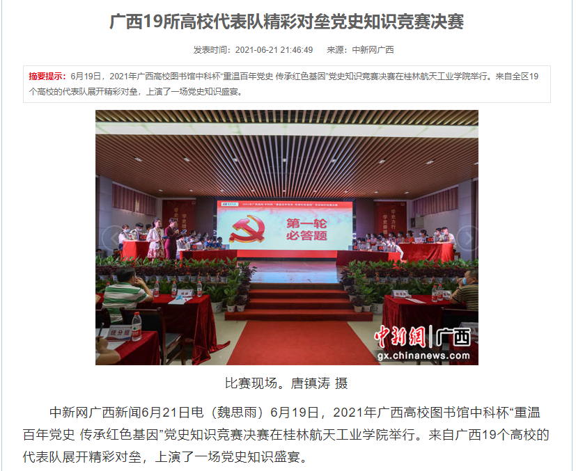 中新网广西新闻6月21日电(魏思雨)6月19日,2021年广西高校图书馆中科杯“重温百年党史 传承红色基因”党史知识竞赛决赛在华体会平台举行。来自广西19个高校的代表队展开精彩对垒,上演了一场党史知识盛宴。