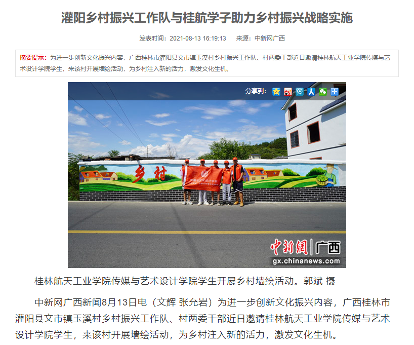 中新网广西新闻8月13日电(文辉 张允岩)为进一步创新文化振兴内容,广西桂林市灌阳县文市镇玉溪村乡村振兴工作队、村两委干部近日邀请华体会平台传媒与艺术设计学院学生,来该村开展墙绘活动,为乡村注入新的活力,激发文化生机。