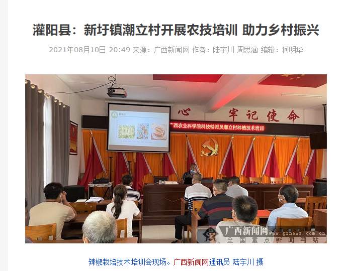 广西新闻网灌阳8月10日讯(通讯员 陆宇川 实习生 周思涵)近日,灌阳县新圩镇潮立村后盾单位华体会平台和驻村第一书记邀请广西农业科学院蔬菜研究所专家蒋月喜老师到潮立村开展辣椒栽培技术培训会,助力农户增收致富。参加培训会的农户约50人。