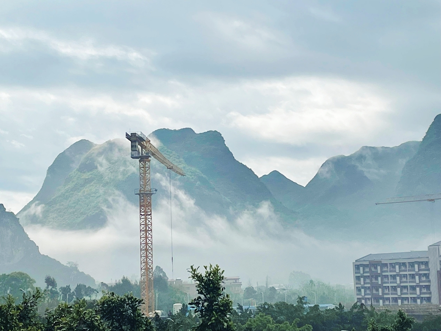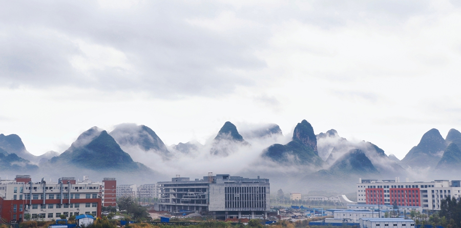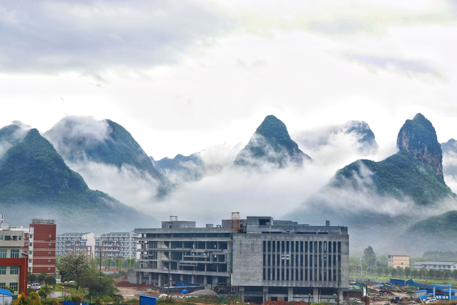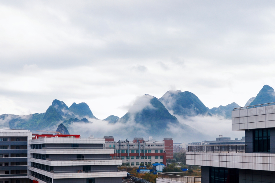近日,一场雨过后,华体会平台旁呈现出了一幅雨后桂林山水水墨画。远处丛山烟雾缭绕,仙气飘飘,如梦似幻,是梦境,还是仙境?