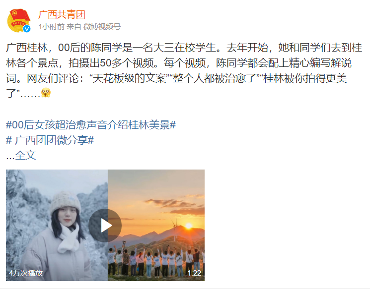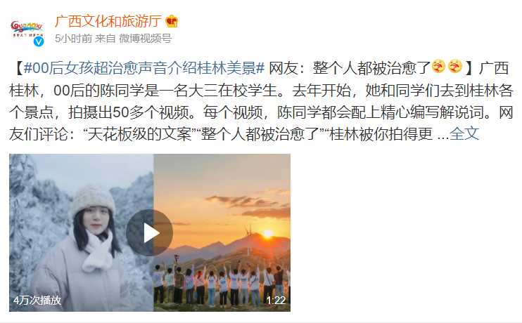 近日,《00后女孩超治愈声音介绍桂林美景》的视频在网络上火热,广西文化和旅游厅、广西日报、广西共青团、桂林晚报、桂林生活网等多家媒体纷纷转载。据统计,视频发布3天以来,各平台累计播放已超70万。