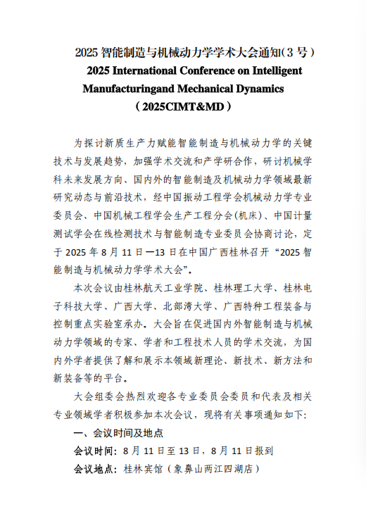 2025智能制造与机械动力学学术大会 2025 International Conference on Intelligent Manufacturing and Mechanical Dynamics(2025CIMT&MD)