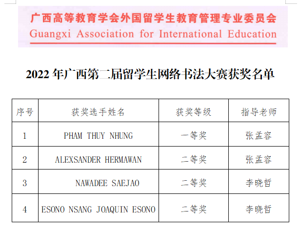为丰富留学生校园文化生活,营造浓厚的中文学习氛围,激发留学生们书写汉字的热情,感受中国汉字和诗词之美,近日,我校组织了境内外四名留学生报名参加了由广西留管学会主办的第二届留学生网络书法大赛。
