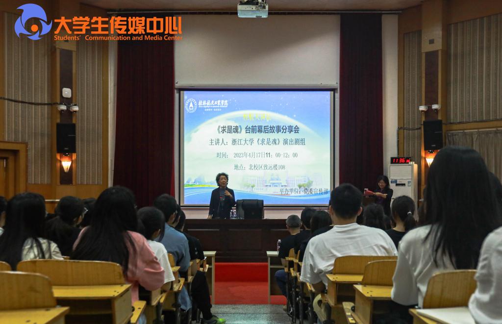 我校学生在大美桂林山水之中为浙大师生带来了山歌演唱和航模飞行表演,随后40多名浙大师生与200多名观看了《求是魂》演出的在校师生一齐参加了《求是魂》台前幕后故事分享会。浙大演出团队精心分享创作心得,我校学子积极提问,会场气氛融洽热烈。