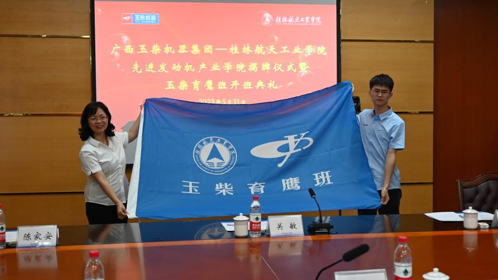 会上,关敏代表玉柴集团向学校捐赠了国六发动机等教学设备,并为“玉柴育鹰班”授了班旗。