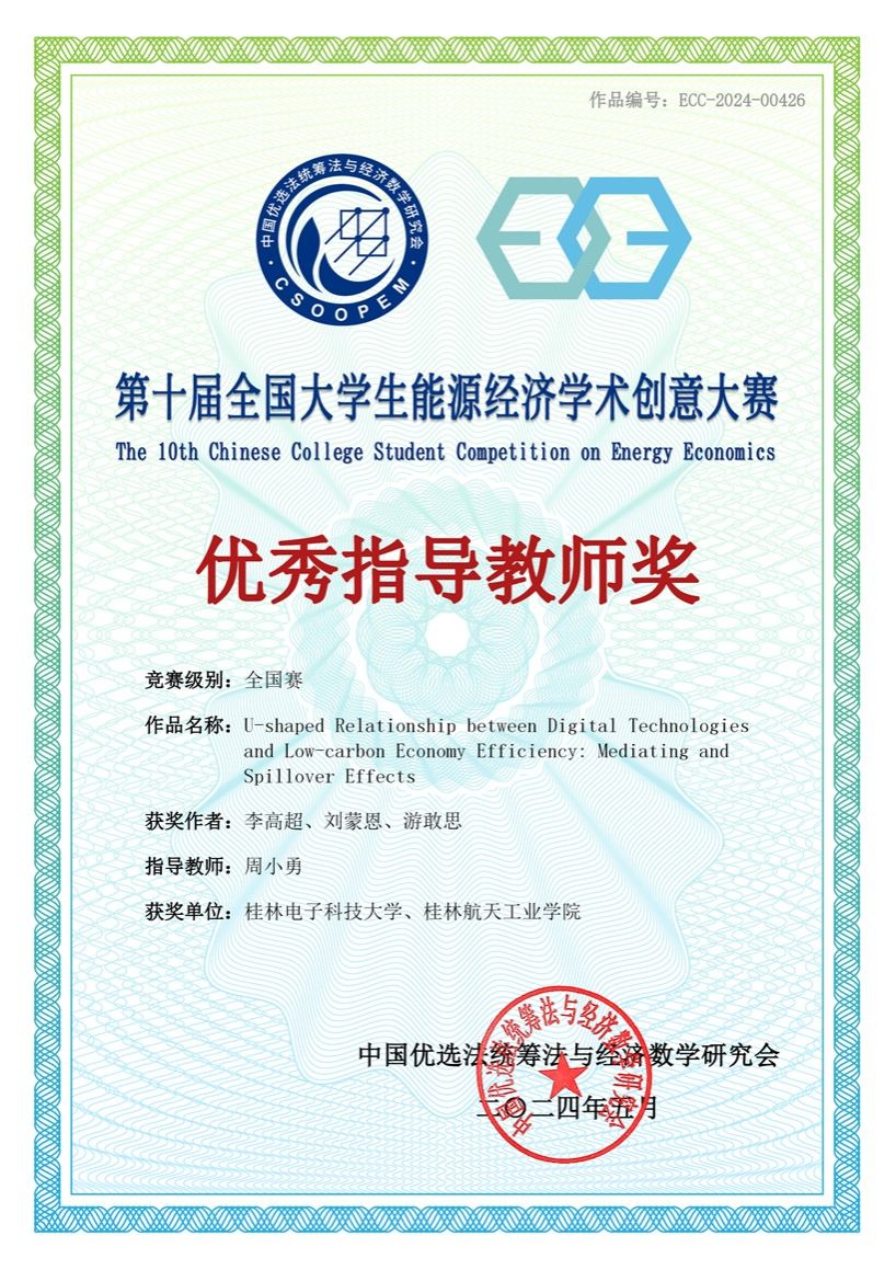 近日,第十届全国大学生能源经济学术创意大赛在中国地质大学(北京)圆满落幕。由我校数智碳中和创新团队带头人周小勇指导的研究生团队经过校赛、区域赛和国赛的激烈角逐,参赛作品“U-shaped Relationship between Digital Technologies and Low-carbon Economy Efficiency: Mediating and Spillover Effects”(团队队长:李高超;指导老师:周小勇)荣获研究生组国赛一等奖,周小勇获评优秀指导教师奖。此次获奖实现了我校在该项赛事的重大突破,也标志着我校在联合培养研究生和指导研究生参与学术竞赛方面迈上了更高的台阶。