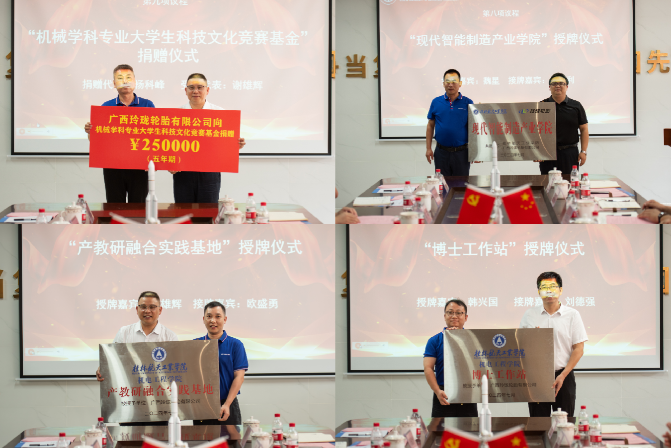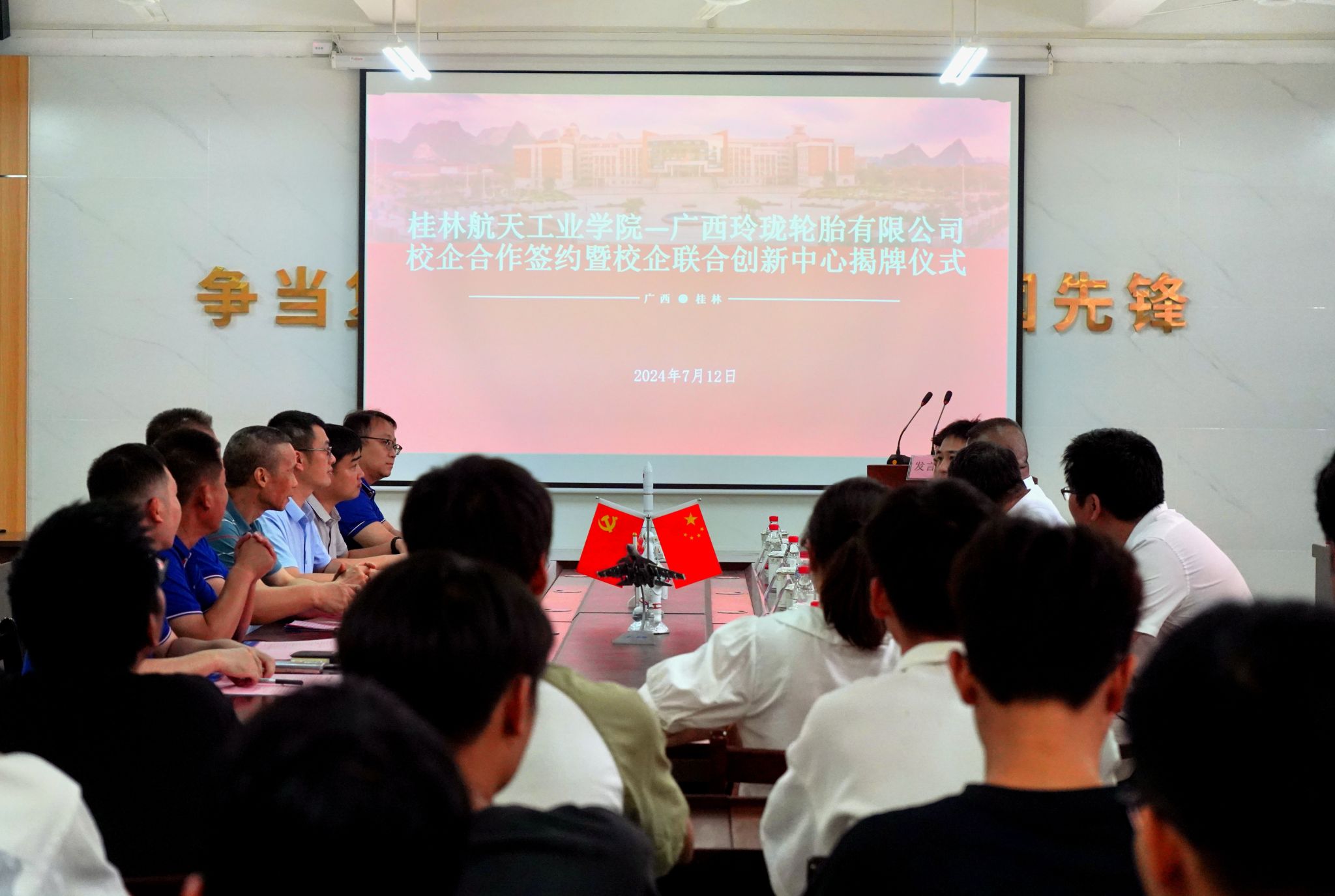 为推动产教融合发展,实现“共赢未来人才”“共享优势资源”“共建发展共同体”目标,助推校企双赢及高质量发展,7月12日下午,华体会平台与广西玲珑轮胎有限公司校企合作签约暨校企联合创新中心揭牌仪式在巡天楼举行。柳州市科技局一级调研员郑晓鸿、柳东新区管委副主任黄敏、柳州市科技局农业农村与社会发展科技科科长周毓婷等政府领导,广西玲珑轮胎有限公司总经理杨科峰等企业代表,学校副校长张烈平,科技处负责人及机电工程学院负责人、80余名师生代表参加会议。