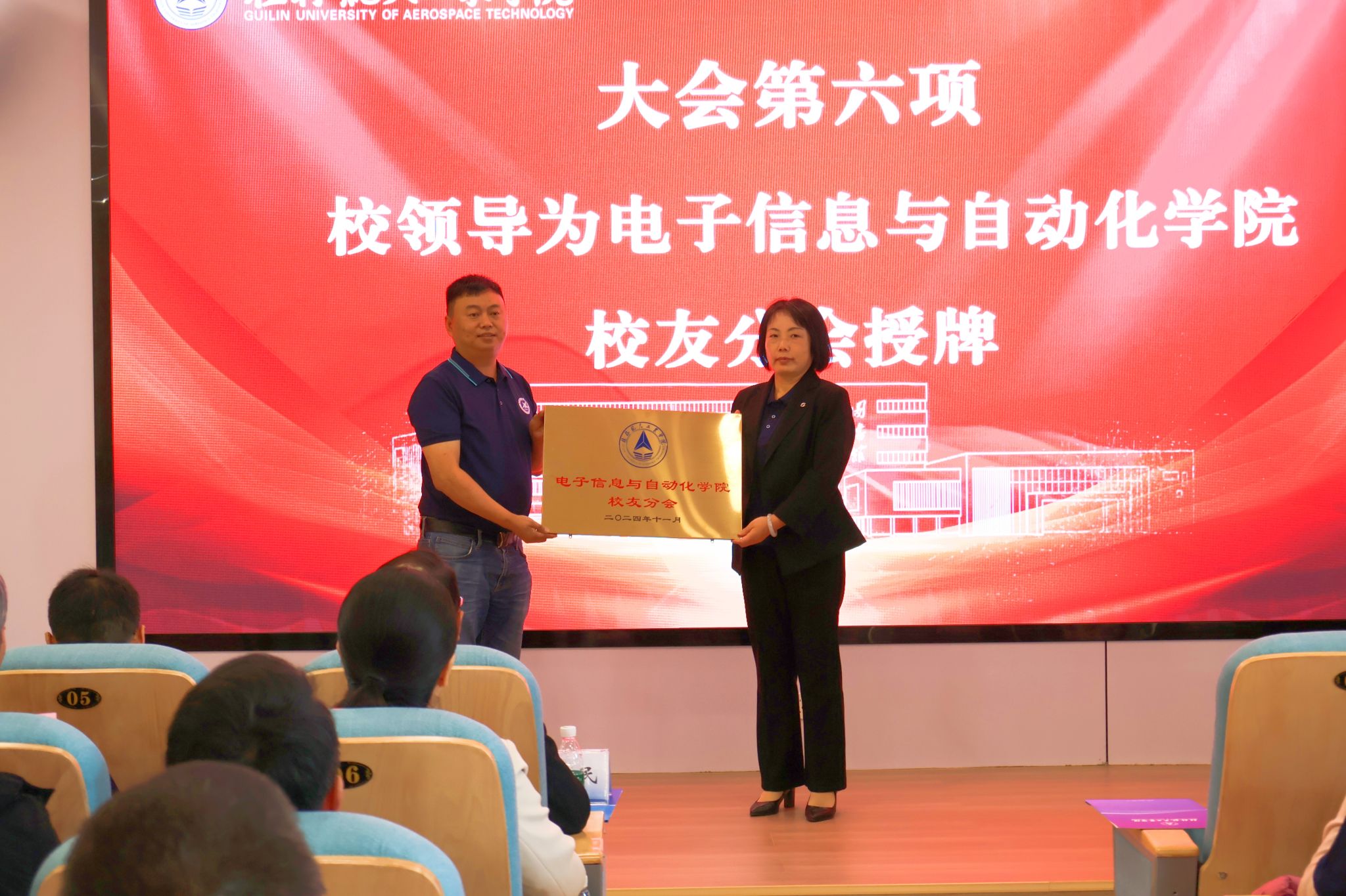 葛莉在致辞中提到,桂航校友在工作岗位上用显著的成绩,为母校赢得了广泛的赞誉,践行了“昨天我以桂航为荣,明天桂航以我为荣”的诺言。今年是新中国成立75周年,桂航建校45周年,在一代代桂航人勠力同心的建设下,桂航实现了“办学层次、办学空间、办学规模”三个重大突破。希望电子信息与自动化学院的校友与母校加强联系,多来“电”,多发“信”,多“自”主,多行“动”。希望每一位桂航人都能传承“艰苦奋斗、自强日新”的精神,牢记“尚德、博学、慎思、笃行”的校训,永葆向上的激情与动力,和母校携手并进,同向而行,共同谱写教育强国建设的“桂航篇章”!